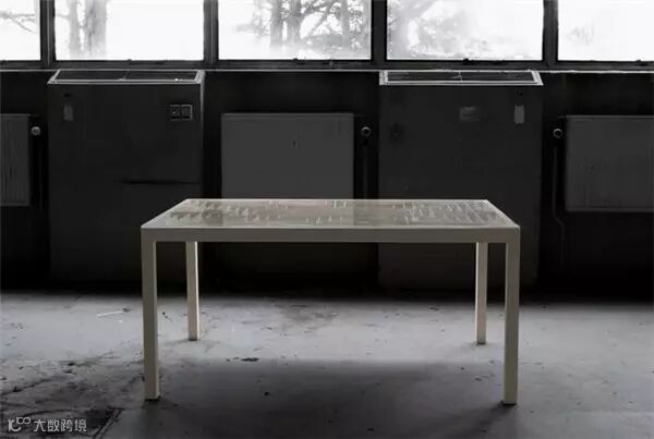 在玻璃台面下,设计师营建了一个独立的微型迷宫世界 ,迷乱的围墙中有六个人物穿梭其中。