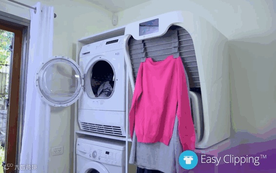 这台机器试图要做的,就是尽可能地削减洗涤过程中的步骤。它就像一台长方形的衣柜,可以适应狭小的空间,使用时先把衣物挂在可伸缩的金属衣架上推进洗衣机内,就可以洗衣和干衣。