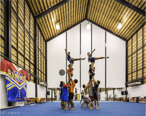 此外,主建筑往后延伸增建的新场馆,则有别于主建筑低矮的造型,是为赢得多项国际比赛的校内啦啦队训练而量身打造之训练馆。