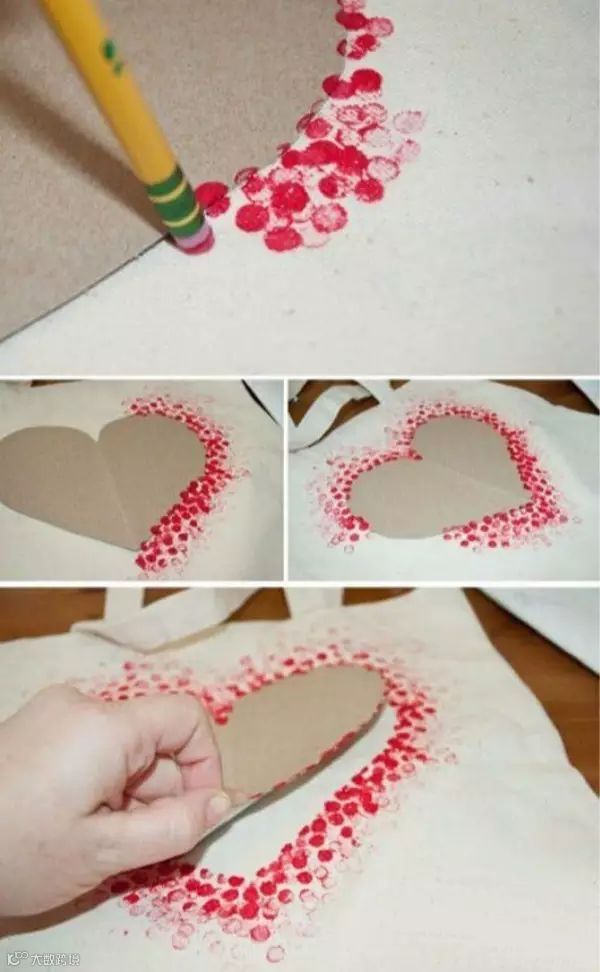 ▼剪一个爱心图案的硬板纸,铅笔尾端橡皮处蘸上粉色颜料,再沿着形状点一圈,一个美丽的心形图案就大功告成。