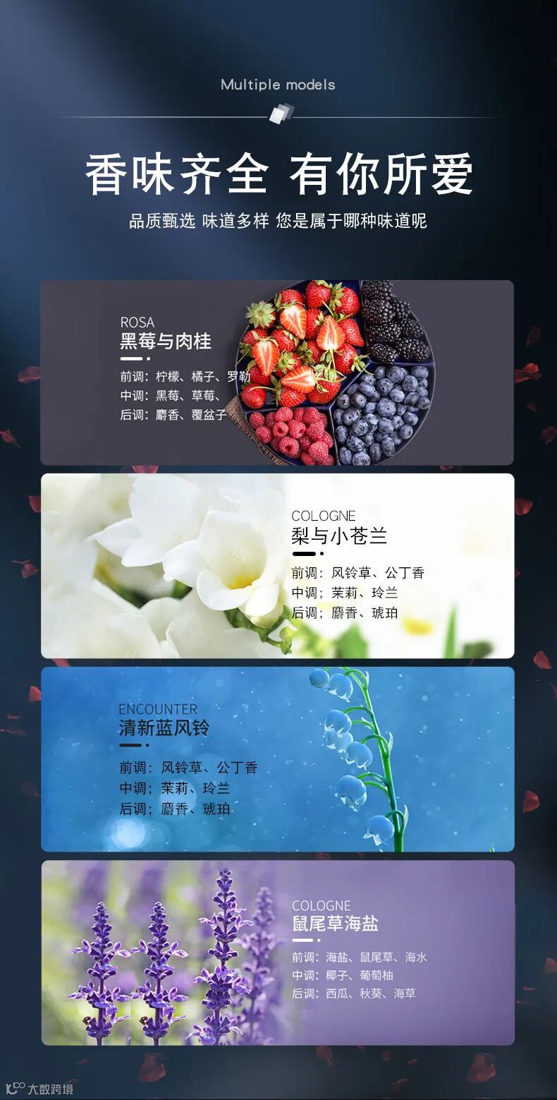 它的香味不同于市面上传统的气味,共有两种款式八种味道可选,轻奢淡香高贵馥郁,每一款都如高端香水般有着前、中、后调的嗅觉体验: