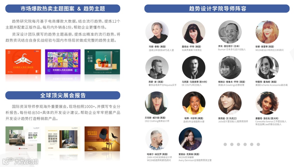 在互联网电商大数据上,利用智能AI基于电商爆款大数据,每月各有内外销《市场爆款&热卖主题图案》画册。画册分析2大内容模块,12个图案主题及7个主题延展,具体开发建议、生命周期和色彩搭配并配套正版作品。让企业更加直观地了解如何运用图案打造爆款。