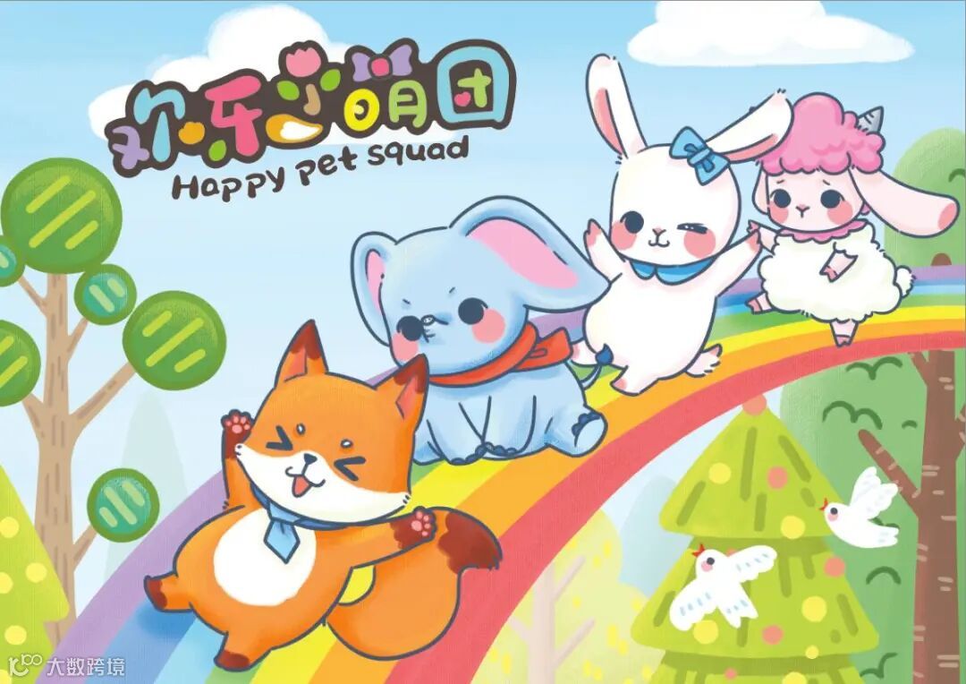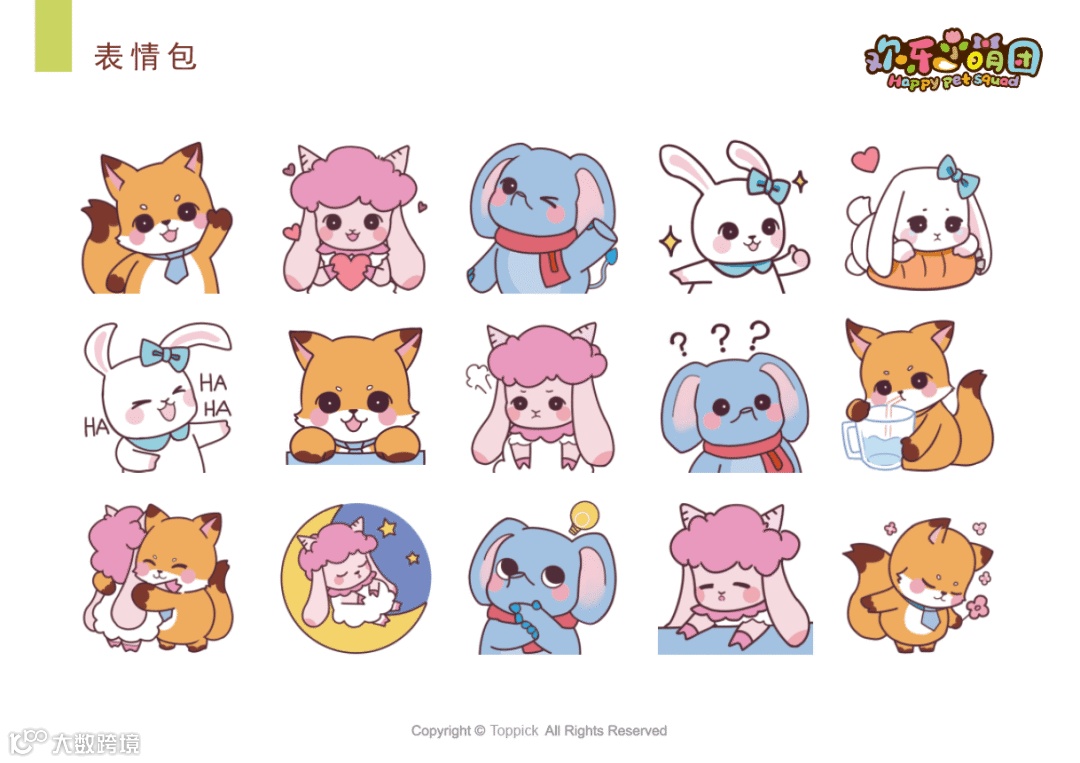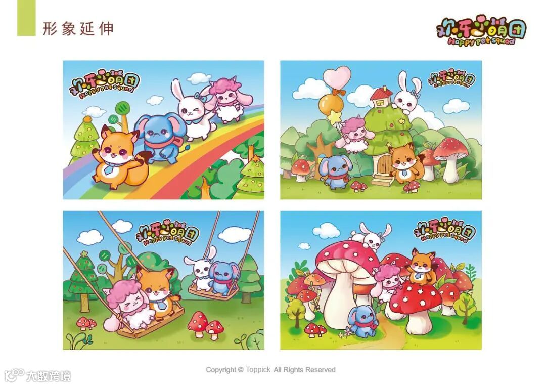 欢乐小萌团IP是由4个可爱的小动物组成:小狐狸豆豆、小白兔美美、小绵羊希希、小象小胖。