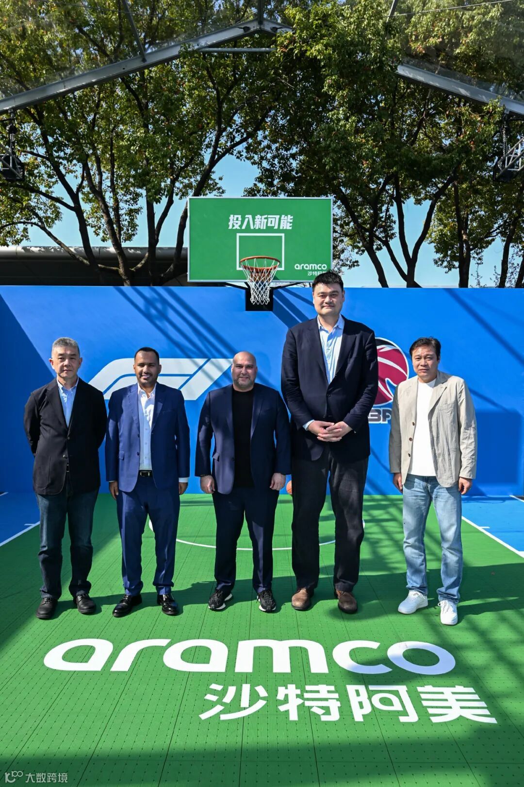 从左至右分别为:中篮联(北京)体育有限公司总经理蒋健先生、阿美亚洲公共事务副总裁优素福·穆泰里先生、阿美亚洲总裁赛乐·扎伊德先生、姚基金创始人姚明先生以及中国足球传奇人物范志毅先生在现场合影留念