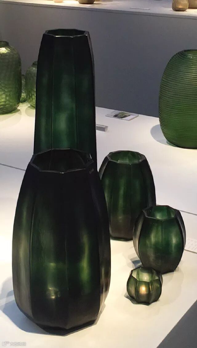 和刻面一样,展会上也有很多随意切面的玻璃例子。超大尺寸的、矮胖的、沉重的花瓶和提灯带来真实的宣言。