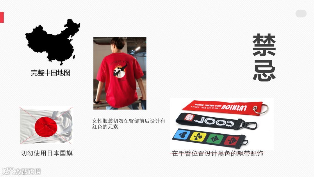 你在韩国人那里不讲究的东西可以,但是韩国人不认为它是禁忌,但是在我们中国文化5000年的历史里面,绝对是禁忌,用在袖子上尤其放在一块黑布上别那个东西绝对是禁忌,然后最大的禁忌最就是日本国旗,这东西谁用谁倒霉,曾经有一个明星就穿这么一件衣服,然后被骂的体无完肤,你们可以去查一下。所以说在国内销售市场里面,禁忌使用日本国旗,然后还有一点就是不完整的中国地图是绝对禁用的,任何服装设计里面,只要是中国设计师,你设计服装里面用到中国地图,你就要用完整的地图,如果你用不完整的地图,是绝对禁忌的。这些就是绝对因素。