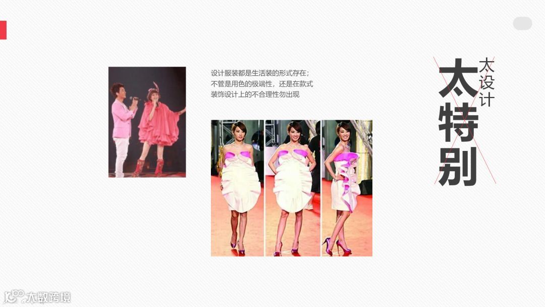 我对这里面的演员没有攻击性,因为他们穿那种服装的时候,多数都不是那个生活装的形式存在,我们设计服装都是生活装的形式存在。现在很多企业推出的这个设计,真的就是怎么说,就是太设计太特别,某些品牌为了追求自己的独特性,然后做了一系列他这个设计里面,不管是用色的极端性,还是在款式装饰设计上的一些设计的不合理性都会出现,导致你的服装的不好卖,产品都不好卖,所以说在商品化的服装销售市场里面太设计太特别的东西是我从来不建议去做的。这里其实有很多图片可以提供,但是因为涉及到这些品牌,所以说我也不太好把图片拿出来。只能说是说到这里,因为这个东西真的很不好把握。