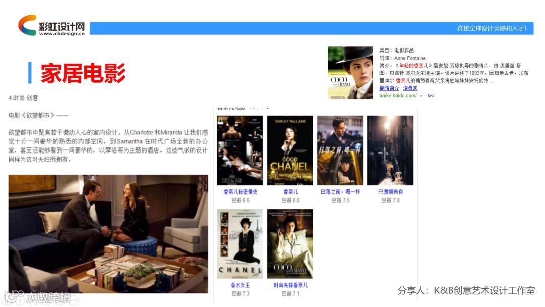 《香奈尔》,一个时尚品牌的创始人,通过这个电影电视剧可以了解这个创始人他一生追求的时尚设计,包括它当时是生活的背景,加上一些我们的设计理念,从而设计出更好更创新的一些产品。希望大家能把这些影视名称记下来,然后进行回去之后慢慢看。