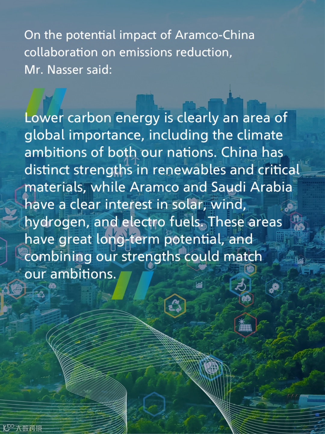纳瑟尔特别指出,减排、材料研发和化工行业是沙特阿美与中国战略合作伙伴开展合作的关键领域。