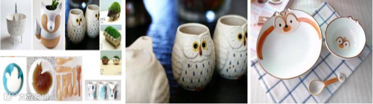 偏向简单或可爱画风的动物造型,搭配上主要材质,如光泽明亮的陶瓷,木板充满原始气息的木纹,整体感觉贴近自然融入生活在忙碌的生活中给人一种舒适感