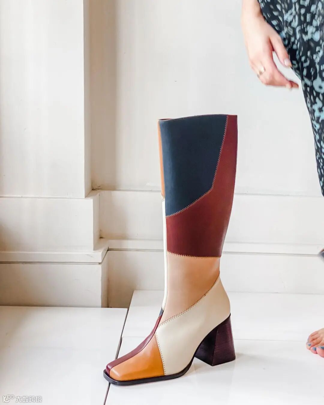 几何拼色复古西部靴,