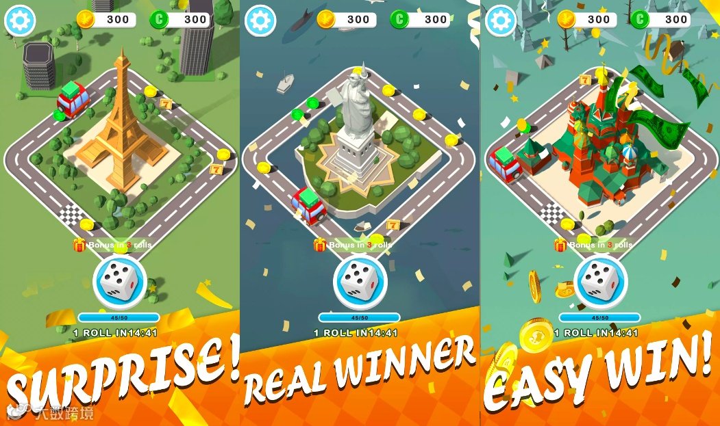 《World Tour - Lucky Road》将经典桌游与卡通风格完美融合。玩家只需掷出魔法骰子,就能在棋盘上前行,解锁世界各地的城市与地标。无论是巴黎的埃菲尔铁塔,还是纽约的自由女神像,都能随着你的旅程逐步点亮。