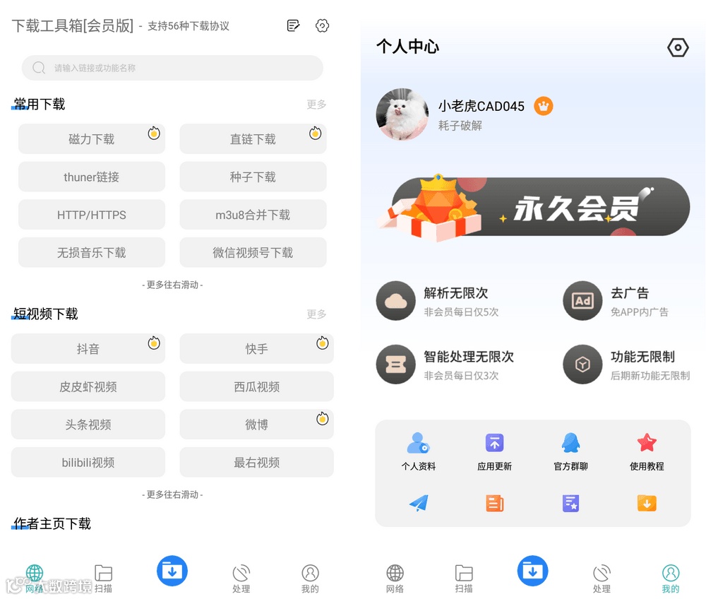 一款堪称万能下载的工具,支持超过56种下载协议,并且软件已解锁永久会员,无限次数——下载工具箱会员版