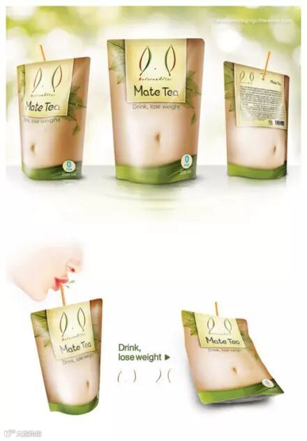 减肥茶包装上印有肚皮的图像,随着减肥茶逐渐喝完,本是圆鼓鼓的“肚子”就变得扁平扁平,真是幽默、生动又巧妙。