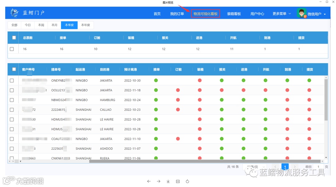 1、可在首页查看所有单子的进展情况,通过色点了解单票进度,左上角时间段的选择可以进行阶段性查看统计