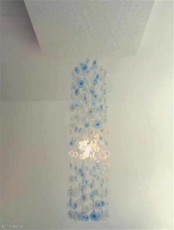 由于机场的安检,几乎每天都会有大量饮料瓶被扣留,设计师Stuart Haygarth就在机场搜集到这些废弃的饮料瓶,将其剪裁底部,串联成固定的形状,并在内部装了LED灯,形成了好看的水滴吊灯。