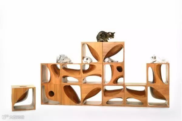 每个立方体上都雕刻出了不同形状的不规则孔洞。这些孔洞可以让猫咪在其中自由玩耍,更棒的是,多个模块化的立方体可以按照你的喜好自由组合,还能当作坐凳、书架来使用。