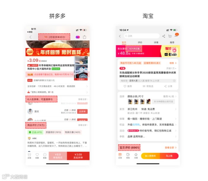 滚动展示的用户购物信息:「谁谁谁又拼单成功了」「这件商品被拔草了多少多少件」。详情页下单人数和上万的评价无时无刻不在引导和刺激用户,有几万几十万的人做你的前驱和后盾!!你被不断强化加暗示的同时,下一秒你可能就点「去拼单」开始拼团了!