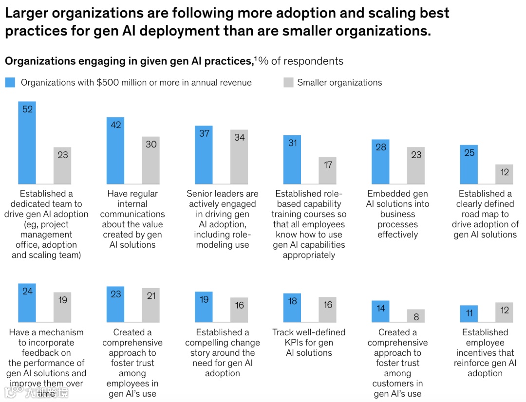 从组织变革的角度来看,大型公司在利用生成式AI创造未来价值这件事上,走在了前面。麦肯锡全球调查发现,为了让生成式AI能真正推动企业发展,产生实际效益,组织们采取了不少关键步骤。