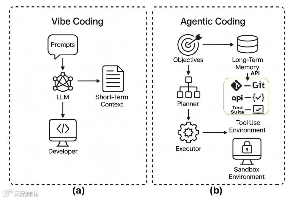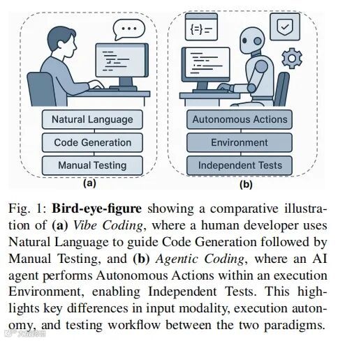 论文聚焦于当前AI辅助编程领域最热门的两个方向:Vibe Coding(氛围编程)和Agentic Coding(代理编程)。这两个概念听起来有些抽象,简单来说,前者是“人机对话式协作”,后者是“AI自主式开发”,代表了AI在编程中两种截然不同的角色定位。