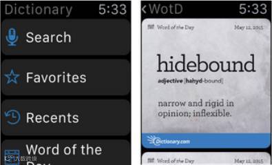 目前看来,手表类APP最适合的交互操作就是手势操作啦,因为他不需要一个可视化控件进行触摸,从而能减少页面元素,也更容易操作。比如滑动就是目前移设备交互中最喜闻乐见的,苹果表中的APP有很多不同项目间的切换会用到这个手势,右滑一般就是返回上一级的意思。比如点击“Word of the Day”会显示当前条目,用户可以通过点击“WotD”或向右滑动返回。