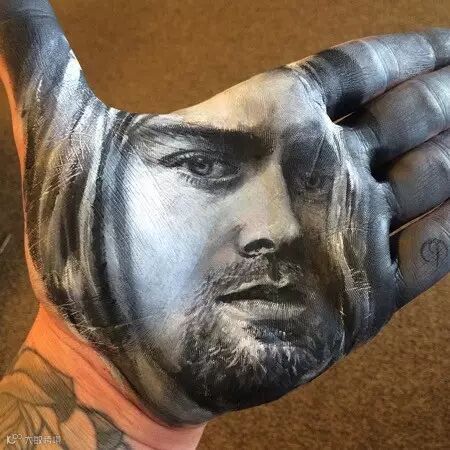 艺术家Russel Powell专注于在手掌上作画,本来平淡无奇的画作因为手掌的纹理显得立体形象,连人物的表情都生动起来。而每次作画后都要在颜料未干之前印在纸上,这才是名副其实的掌中艺术。