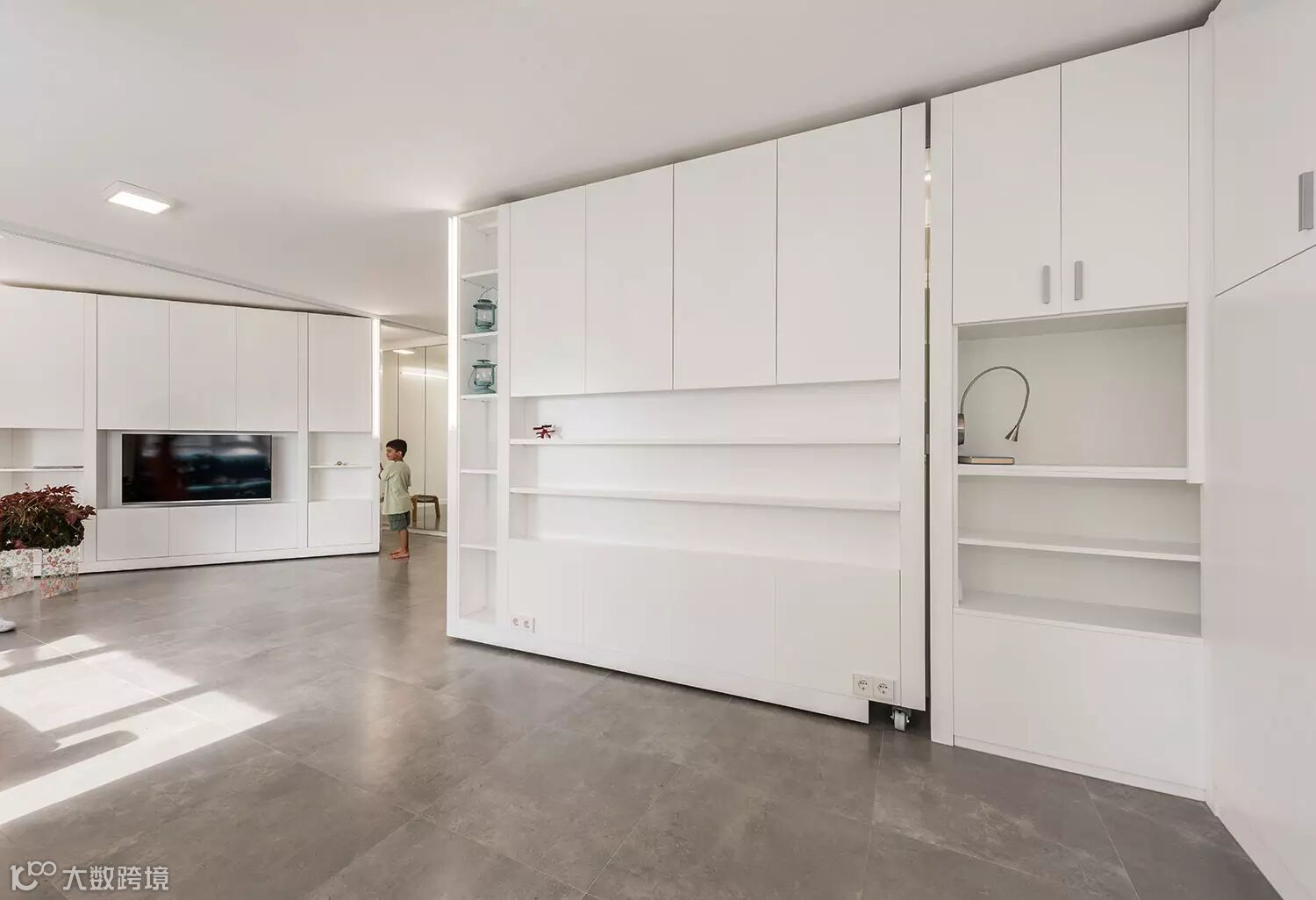 斯特拉的房子位于马德里的市中心,她是哥伦比亚人,她丈夫是英国人,所以他们家经常有来自大西洋两岸的亲戚朋友来家里作客,他们有两个孩子,如果预留一间客房就大大压缩了他们的公共空间,因为客厅才是他们家的中心,让朋友在客厅睡沙发床又太无奈,通过机械装置让一个墙壁移动4米,灵活的客房就成了他们最好的选择。