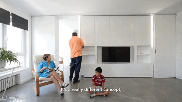 两个旋转的家具瞬间把一个大客厅区隔为2个卧室和一个小客厅。