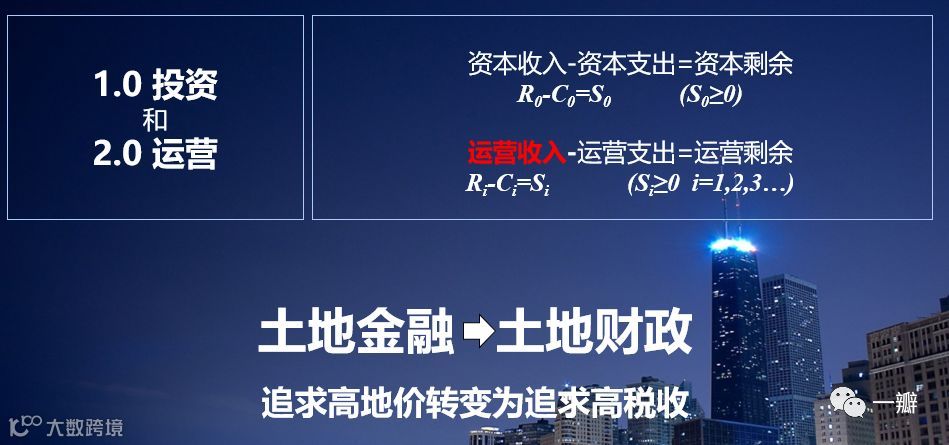 通过卖地来修路、修桥的时代将要结束了。我们现在要赶快挣钱而不是继续花钱,每一寸土地产生多少税收比土地卖多少钱更重要,税收、现金流成为衡量一个城市成败的新标准。金融积累阶段已经完成了,开始进入运营阶段,而运营阶段最核心的内容就是你有没有创造收入、有没有创造足够的税收,所以土地要从获取金融一次性的收入为主,变成获取财政可持续的现金流收入为主。当增长从第一个公式转向第二个公式,土地也必须从金融转向财政。
