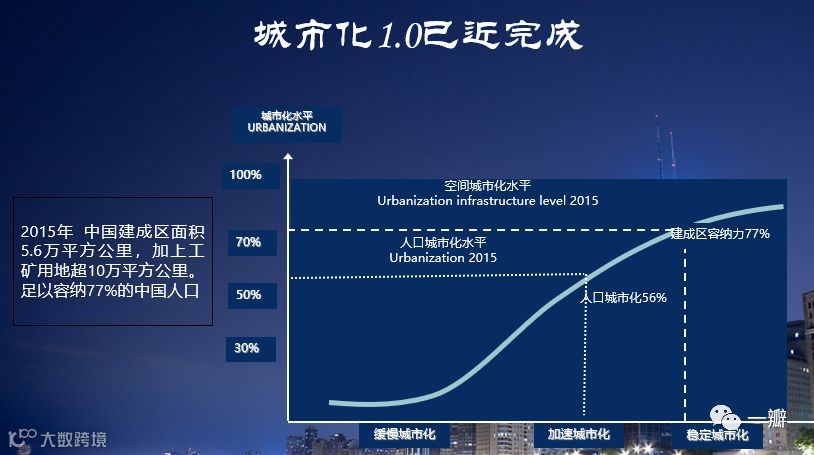 过去40年基本都是靠城市化拉动经济增长,现在这个进程快结束了。大家会觉得不对呀,2011年我们国家城市化水平才第一次超过50%,2015年城市化水平也不过56%,人家日本都是在这个点上开始起飞的呀?但是大家看一下中国的建成区面积,马上就会明白中国城市相对于城市人口其实大大超前了,而和投资真正相关的是建成区面积,而不是人口。