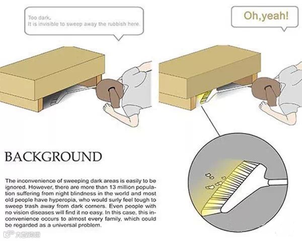 LED灯扫帚,扫帚上安装有LED灯、电池、线路和开关,需要清扫黑暗角落,如床底柜底时,只需打开开关,扫帚就能点亮,让一些原本看不到的垃圾暴露无遗,轻松完成大扫除。
