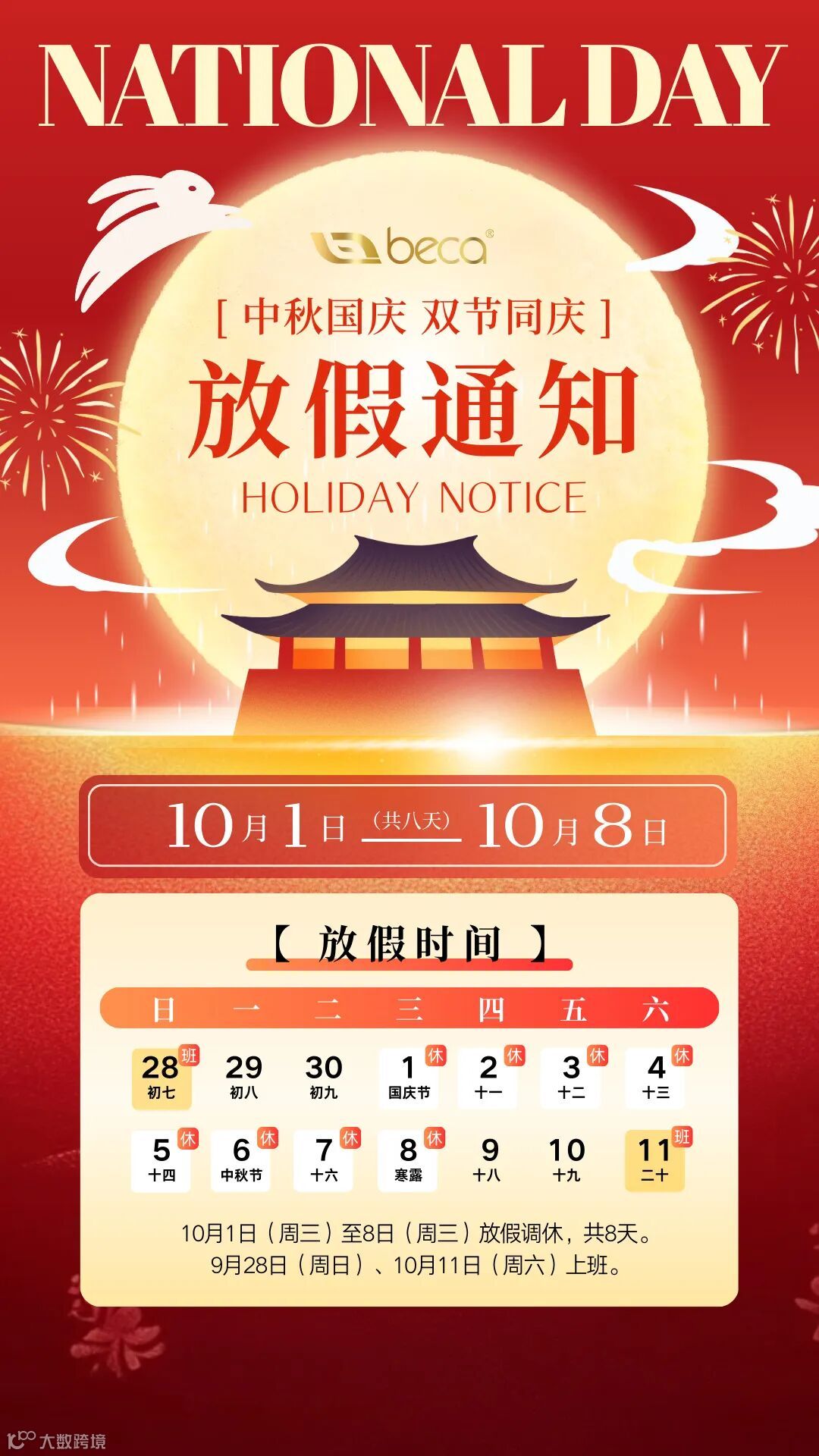 根据国家规定,公司放假时间为 10月1日至 10月8日,共8天。10月9日(星期四) 正式上班,请大家合理安排假期哦~
