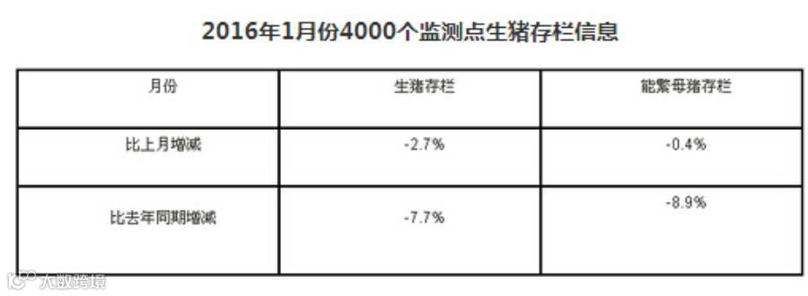 据农业部公布的2016年1月份4000个监测点生存存栏信息显示,1月份能繁母猪存栏跌至3783万头,再减15万头,同比下降8.9%,环比下降0.4%。生猪存栏量同比下降7.7%,环比下降2.7%。