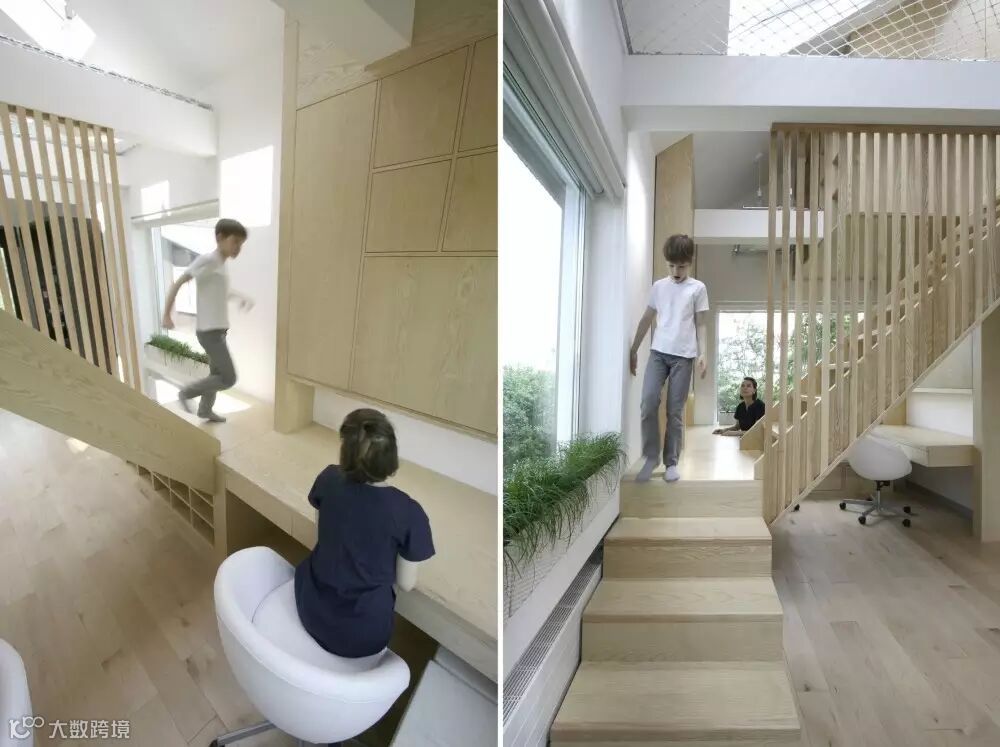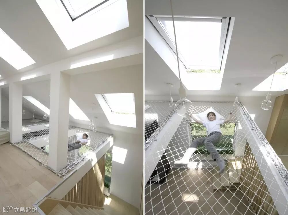 为了给孩子一个有趣的玩耍空间,设计师把一块区域的楼板拆掉,用纤维网隔开上下层空间,形成一个大吊床,让孩子在这里发挥他天马行空的想象力……