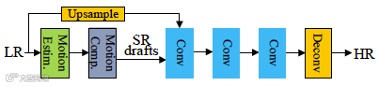 VSRnet是图像超分算法SRCNN在视频上的扩展,最大的改进就是增加了运动估计和运动补偿模块,输入图像由一幅变成多帧。运动信息的提取采用了Druleas算法。