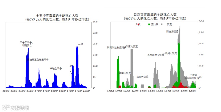 一种是自然现象(第四个因素)。我饶有兴致地看到,以流行病、干旱和洪水形式出现的自然现象,对环境、预期寿命和其他因素,会产生无比重大的影响。例如,从左边的这幅图上,我们能看到多少债务因战争而产生;从右边的图上,我们能看到多少债务因自然现象而产生。你可以看到,在我们所处的环境中,存在着流行病、全球变暖、气候变化发生的风险。你可以看到,环境变化已经开始造成影响。