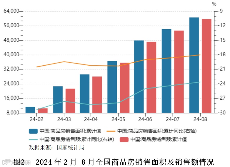 2024年1月至8月,全国新建商品房销售面积60602万平方米,同比下降18.0%,其中住宅销售面积下降20.4%。新建商品房销售额59723亿元,下降23.6%,其中住宅销售额下降25.0%。8月末,商品房待售面积73783万平方米,同比增长13.9%。其中,住宅待售面积增长21.5%。