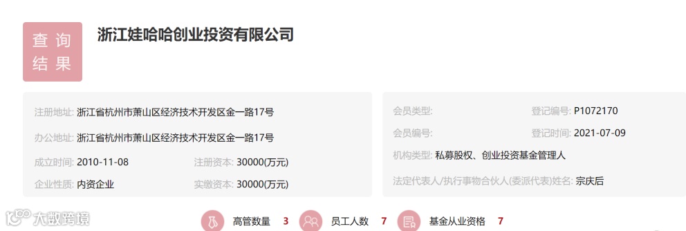 基金业协会官网显示,浙江娃哈哈创业投资有限公司(以下简称“娃哈哈创投”)在7月9日正式完成基金管理人备案登记,娃哈哈集团创始人宗庆后也在7月12日获得了基金从业资格,担任娃哈哈创投的法定代表人。根据资料显示,娃哈哈创投共有包括3位高管在内的7位工作人员取得基金从业资格证书。至此,娃哈哈创投正式闪亮登场!