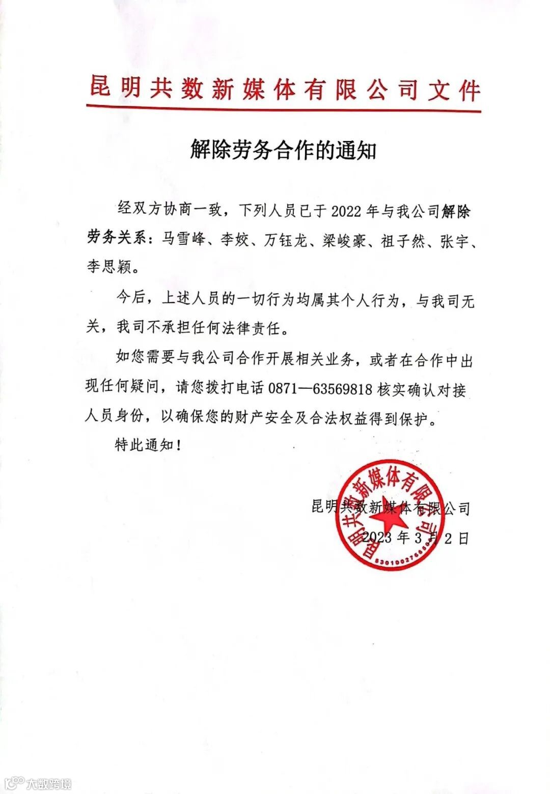 经双方协商一致,下列人员已于2022年与我公司解除劳务关系:马雪峰、李姣、万钰龙、梁峻豪、祖子然、张宇、李思颖。