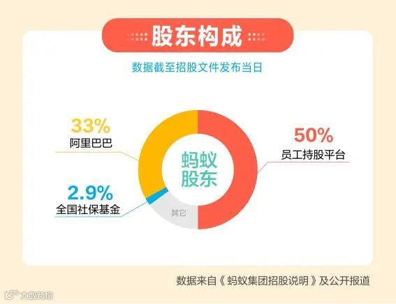 招股文件还披露了蚂蚁集团最新的股东构成情况。截至招股文件发布之日,君瀚、君澳作为蚂蚁的员工持股平台,分别持有蚂蚁29.8%和20.6%的股份,为控股股东。发行完成后,君瀚、君澳合计持股将不低于40%。