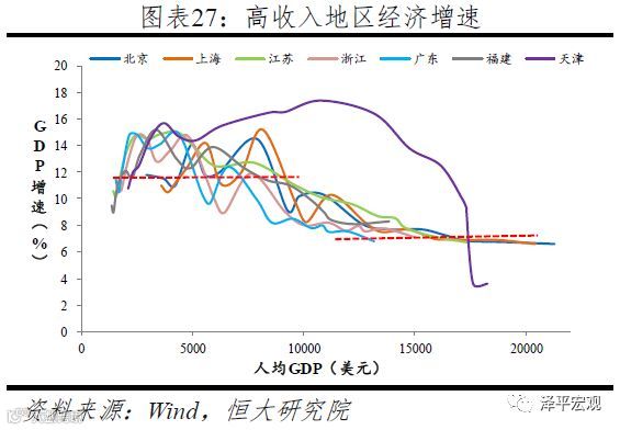 1)高收入地区:京沪津苏浙闽粤7省人均GDP超过13000美元,研发经费投入强度达2.9%,基本实现从要素驱动到创新驱动。当人均GDP发展到10000美元左右时,除天津外的京沪苏浙闽粤六省都出现了经济增长平台切换,经济增长逐渐趋稳,这背后是新旧动能转换。从三产增加值比重看,京沪津苏浙闽粤7省市2018年加权平均为56.4%,明显高于全国平均的52.2%。从研发经费投入强度看,2017年7省市加权平均为2.9%,明显高于全国平均的2.1%,与德国相当,超过美国的2.7%、OECD平均水平的2.5%。2017年7省高新技术企业数和高新技术从业人员分别占全国的66%、59.2%,发明专利授权量占比达61.6%。从万元GDP能耗看,2016年7省市加权平均为0.41,较全国平均低31%。从投资依赖度看,2017年7省市固定资产投资与地区生产总值的比例加权平均为51.8%,大幅低于全国的70.9%。从全国民营企业500强分布看,2017年7省合计占全国近60%,且浙江、江苏、广东的500强企业数明显高于其他省市。