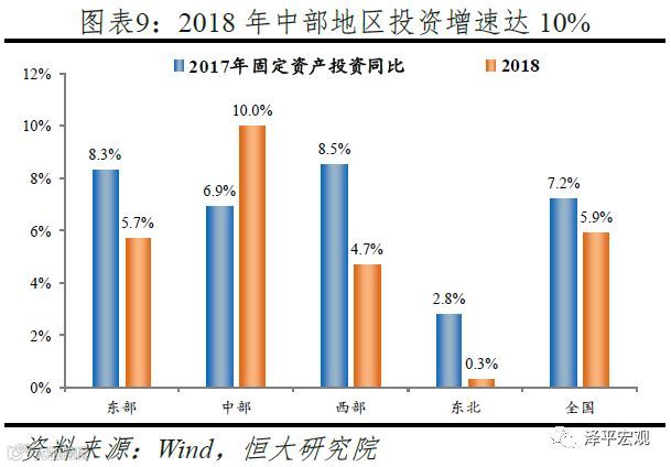 中部地区2018年投资增速逆势上升至10%,明显高于东部的5.7%、西部的4.7%、东北的0.3%,且并非依赖地产投资拉动。2018年中国固定资产投资同比5.9%,较2017年下滑1.3个百分点;但中部地区2018年固定资产投资同比10%,较2017年上升3.1个百分点,逆势上升。从分省数据看,2017年除山西固定资产投资仅增长6.3%外,其他五省增速均在10%以上,这意味着国家统计局在核算2017年中部地区投资时存在一些数据调整。2018年山西固定资产投资增速降至5.7%,河南从10.4%降至8.1%,其他四省均维持10%以上的高增长。在房地产投资方面,中部地区从2017年的11.6%降至2018年的5.4%,这意味着中部地区的高投资增速并非由地产拉动,而主要在制造业投资和基建等领域。从与制造业投资相关的工业生产看,2018年安徽规上工业增加值增速高达9.3%、位居全国第四位,江西为8.9%,湖南、河南、湖北均在7%以上,远高于全国规上工业同比增速6.2%。