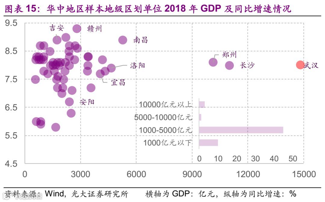 华中地区59个样本中,2018年GDP体量最大的为武汉,规模达1.48万亿,中位数为1913亿元。华中地区GDP规模万亿以上地级市共3个,GDP规模多处于1000-5000亿元,占比74%。