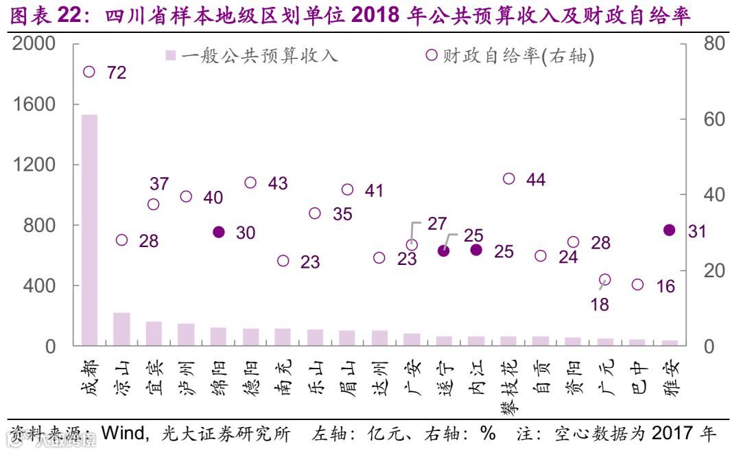 财政方面的情况,2018年一般公共预算收入最大的为成都,为1529亿元,西南地区50个样本中一般公共预算收入的中位数为74亿元。