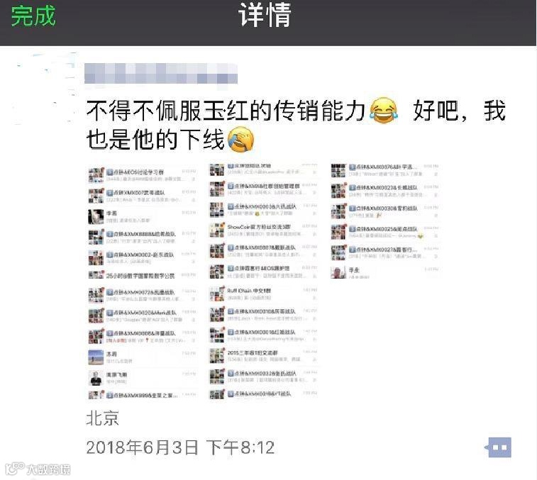 在“三点钟”热度最高的时刻,玉红推出了XMX项目(XMax),代号“小梦想”。为了这个项目,他将社群裂变玩到了极致:99个分舵群,数百位KOL站台,那句“跟随红姐不迷路”的口号,像传销般在微信生态中病毒式传播。