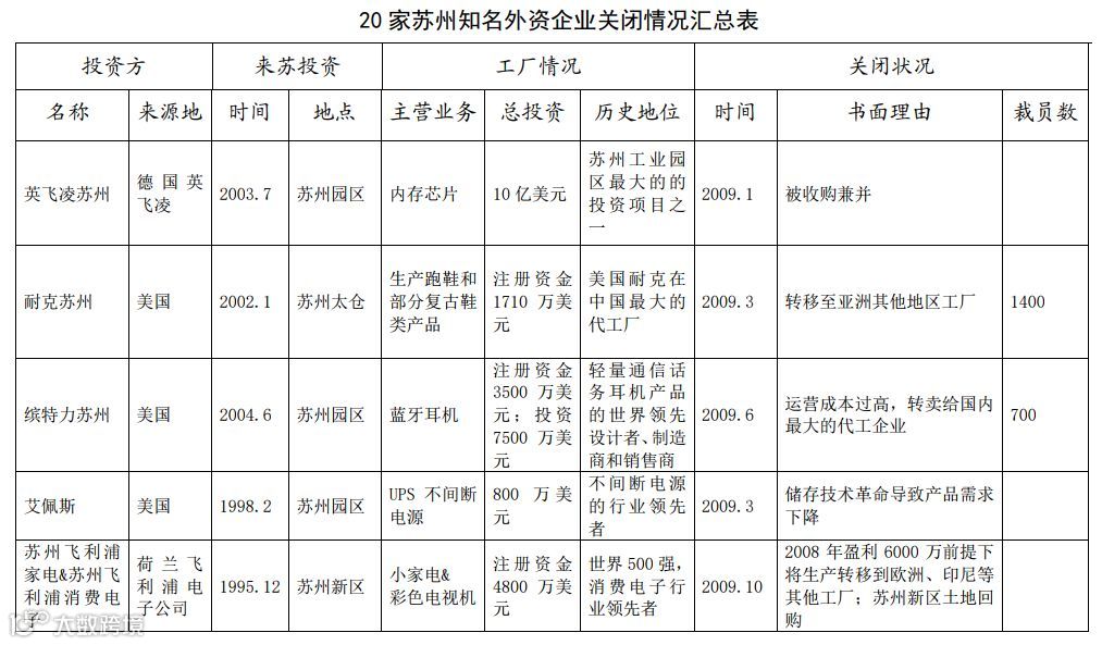 最近我们带着问题访谈了许多被关闭企业的中层以上干部,询问了数位与外资企业提供高级人才招聘服务的猎头,并通过正规网站查询了自2008年世界金融危机以来知名外企关闭苏州工厂的信息,据此整理了附表“20家苏州知名外资企业关闭情况汇总表”,并把我们的初步分析反映如下,希望对掌握面上情况和制定决策有所帮助。