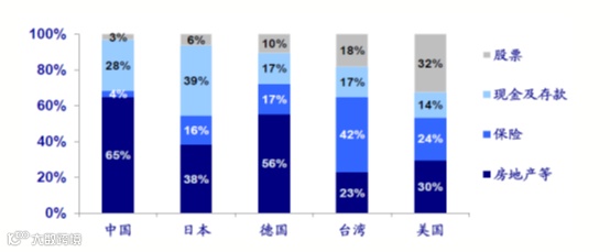 这是中国当前的各类资产配置的占比和其他国家的对比,显然我们对地产需求占比太大了,或者说很可能已经见顶了。
