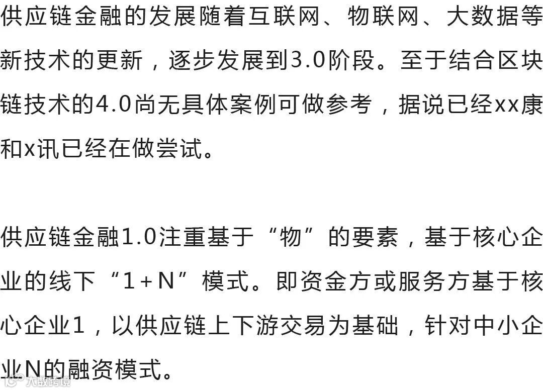 如果一定要对贸易融资和供应链金融做比较,贸易融资可以视作供应链金融1.0这个阶段。贸易融资的原始阶段,是点对点,单对单通过贸易来进行融资的。从依托核心企业的线下“1+N”模式开始,贸易融资就真正进入了供应链金融融资的阶段。