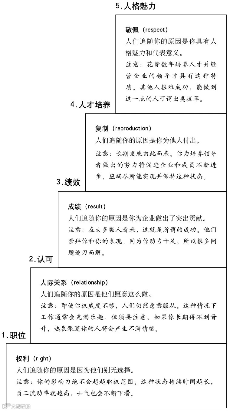 约翰・C.麦克斯维尔将领导力分为5种层次,并详细阐释了每种层次对应的表现。