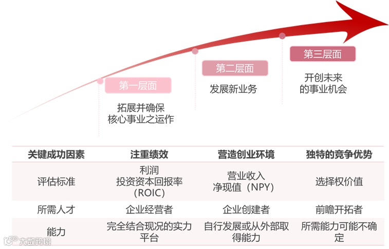 麦肯锡三层面理论的每个层面代表了企业开创和发展业务的不同阶段,并对业务举措和管理技能提出了不同的要求。